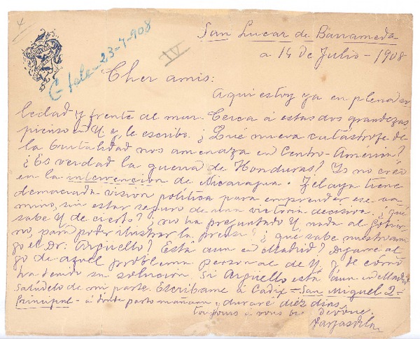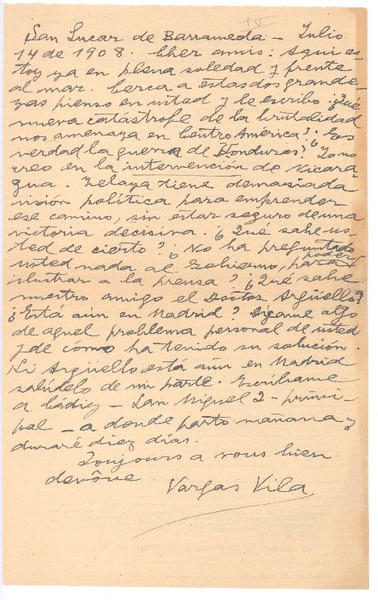 [Carta], 1908 jul. 14 San Lucas de Barrameda, España <a> Rubén Darío [manuscrito] José María Vargas Vila.