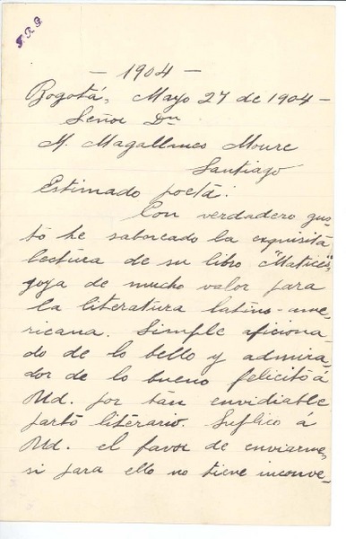 [Carta] 1904 may. 4, Bogotá, Colombia [a] Manuel Magallanes Moure [manuscrito] Francisco Restrepo Gómez.