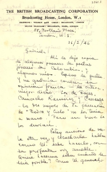 [Carta] 1946 feb. 26, Portland Place, London, [England] [a] Gabriela Mistral, Claridges Hotel, Brook St., London, [England] [manuscrito] Jaime Tello.