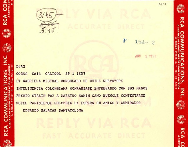[Telegrama] 1945 nov. 19, Bogotá, [Colombia] [a] Gabriela Mistral, Consulado de Chile, Rio de Janeiro, [Brasil] [manuscrito] Antonio Gómez Restrepo.