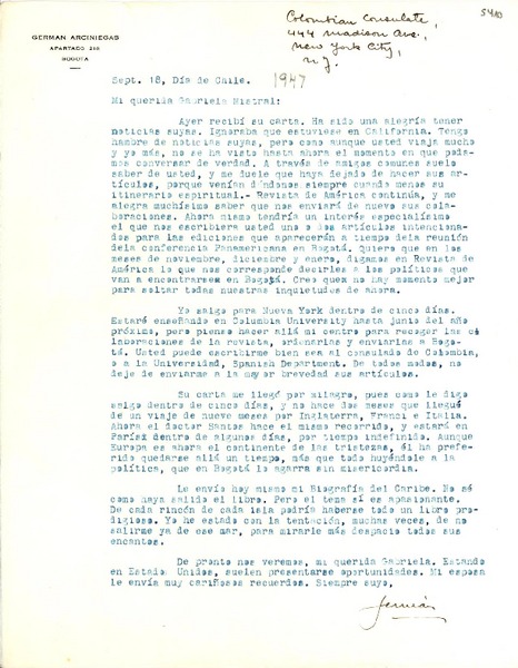 [Carta] [1947] sept. 18, New York, [EE.UU.] [a] Gabriela Mistral [manuscrito] Germán Arciniegas.