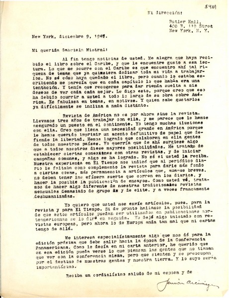 [Carta] 1947 dic. 9, New York [a] Gabriela Mistral [manuscrito] Germán Arciniegas.