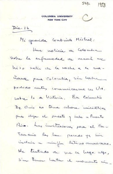 [Carta] [1953] dic. 16, [New York] [a] Gabriela Mistral [manuscrito] Germán Arciniegas.