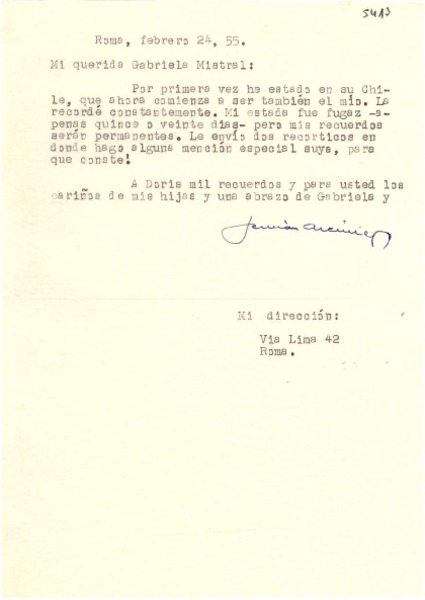 [Carta] 1955 feb. 24, Roma [a] Gabriela Mistral [manuscrito] Germán Arciniegas.
