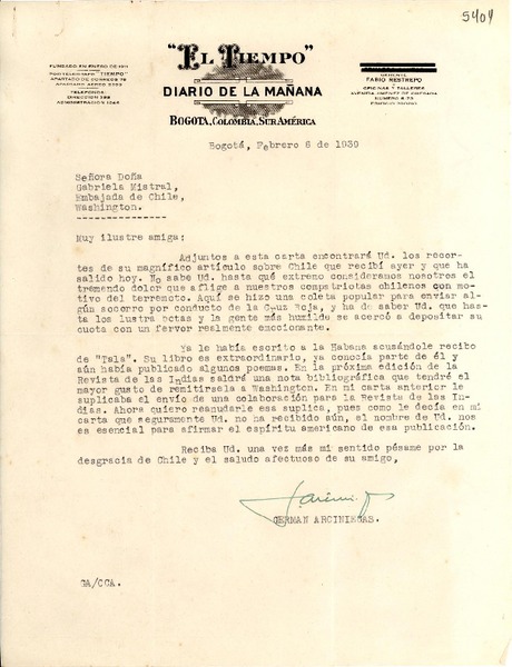 [Carta] 1939 feb. 6, Bogotá, Colombia [a] Gabriela Mistral, Washington [manuscrito] Germán Arciniegas.