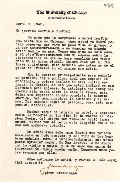 [Carta] 1943 abr. 9, [Chicago] [a] Gabriela Mistral [manuscrito] Germán Arciniegas.
