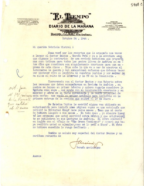 [Carta] 1944 oct. 24, Bogotá, Colombia [a] Gabriela Mistral [manuscrito] Germán Arciniegas.