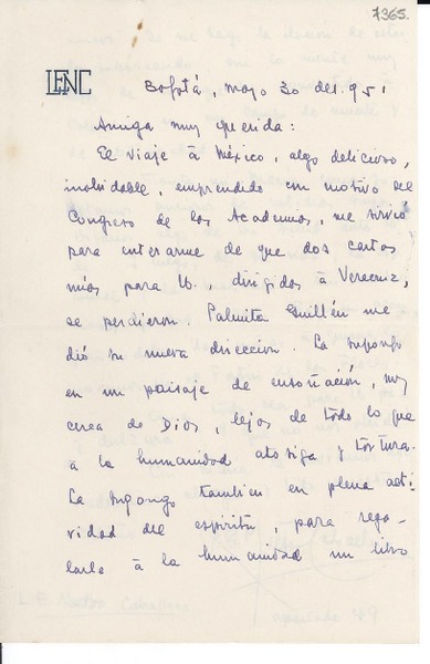 [Carta] 1951 mayo 30, Bogotá [a] Gabriela Mistral [manuscrito] L. E. Nieto Caballero.