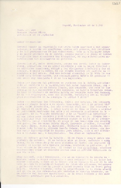 [Carta] 1949 nov. 28, Bogotá [a] Mariano Ospina Pérez [manuscrito] Luis Eduardo Nieto Caballero.