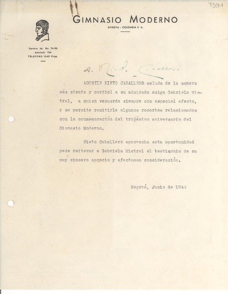 [Carta] 1944 jun., Bogotá, [Colombia] [a] Gabriela Mistral [manuscrito] Agustín Nieto Caballero.
