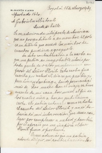 [Carta] 1939 mar. 15, Bogotá, [Colombia] [a] Gabriela [Mistral] [manuscrito] [Baldomero] Sanín Cano.