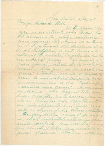 [Carta] 1948 ago 6, San Carlos, Colombia [a] Joaquín Edwards Bello [manuscrito] José Durán Trujillo.
