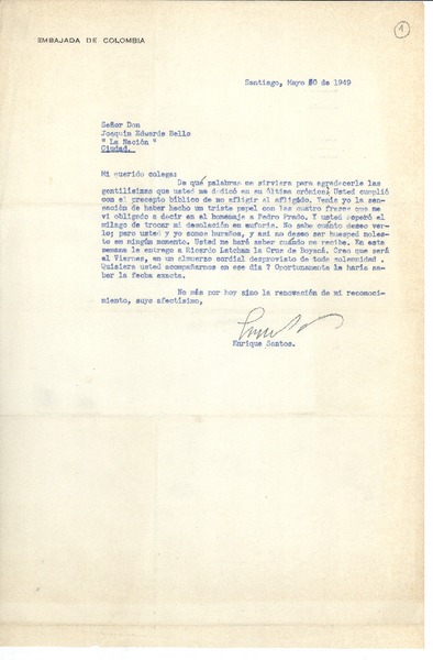 [Carta] 1949 may. 30, Santiago, Chile [a] Joaquín Edwards Bello [manuscrito] Enrique Santos.