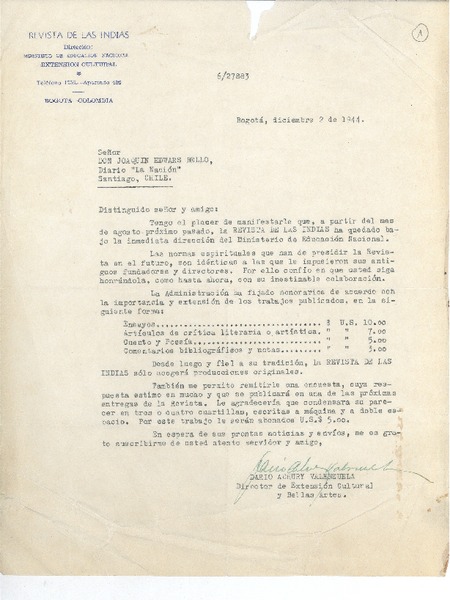 [Carta] 1944 dic. 2, Bogotá, Colombia [a] Joaquín Edwards Bello, Santiago, Chile [manuscrito] Miguel González F.