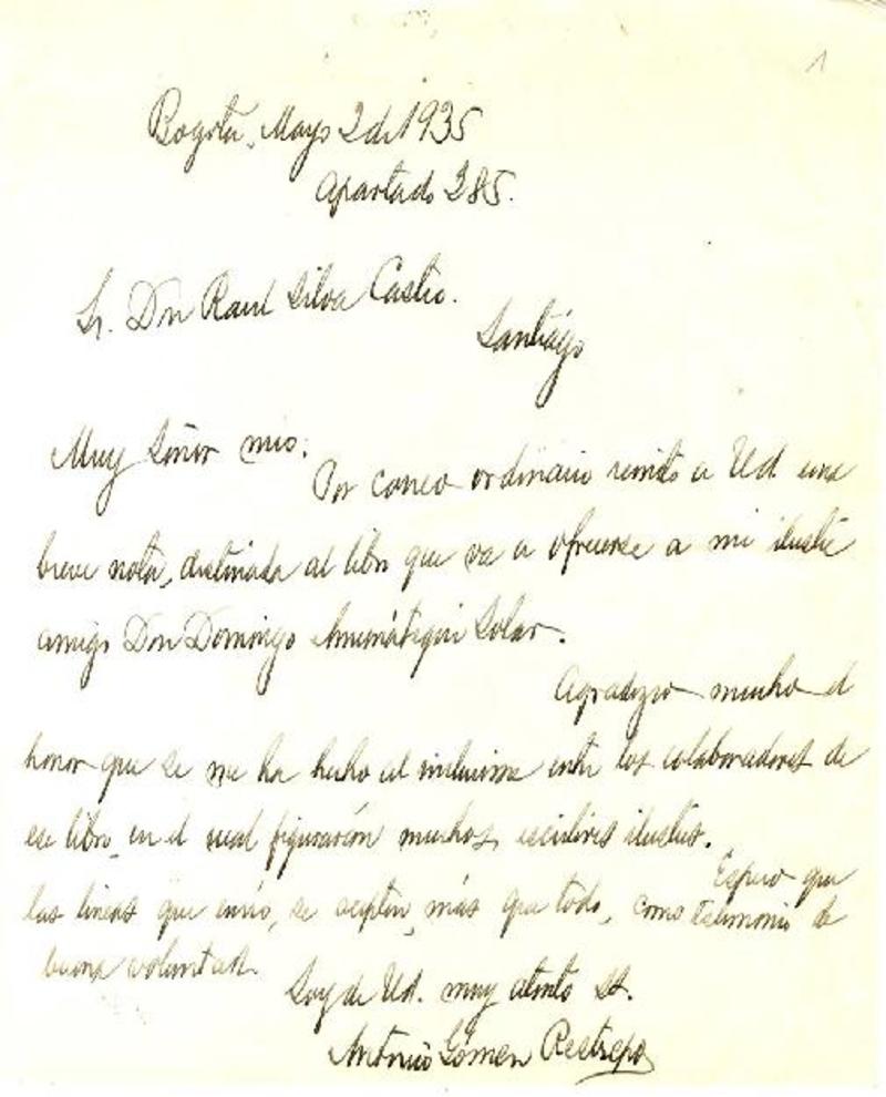 [Carta] 1935 mayo 2, Bogotá, Colombia [a] Raúl Silva Castro [manuscrito] Antonio Gómez Restrepo.