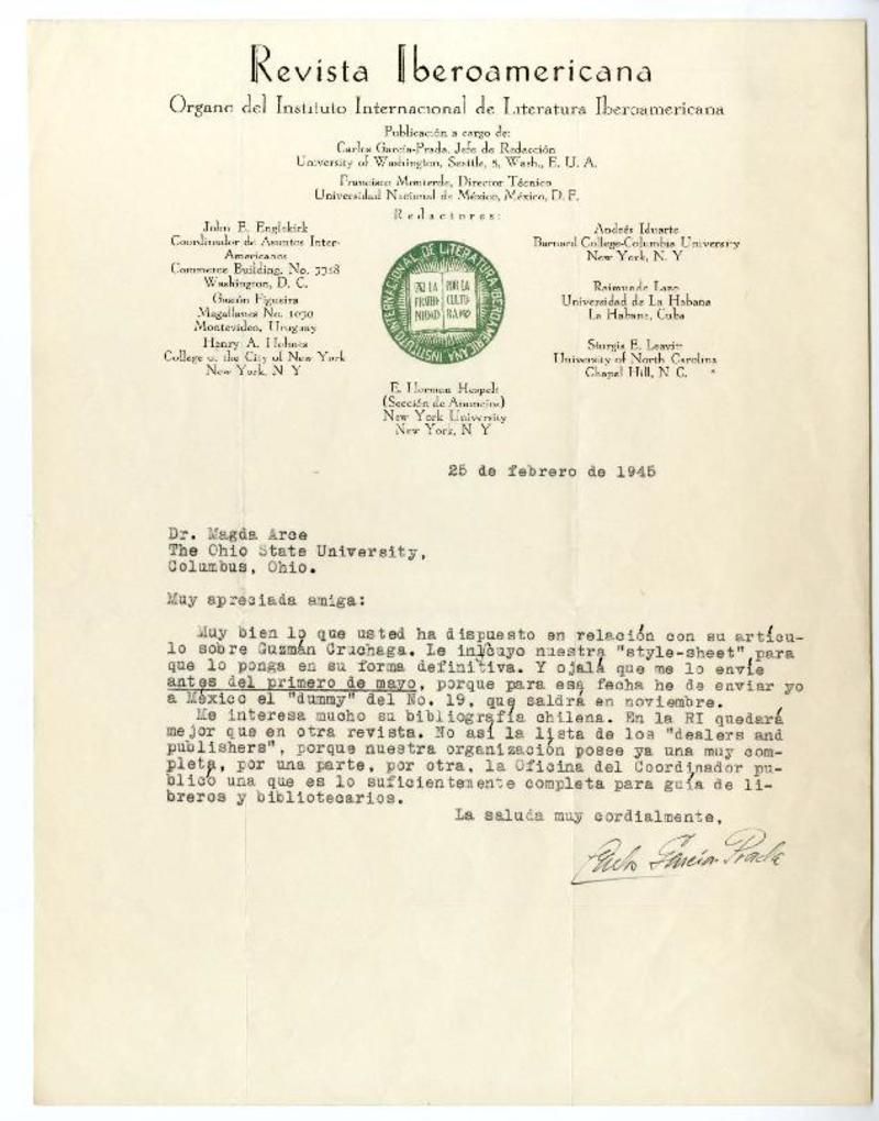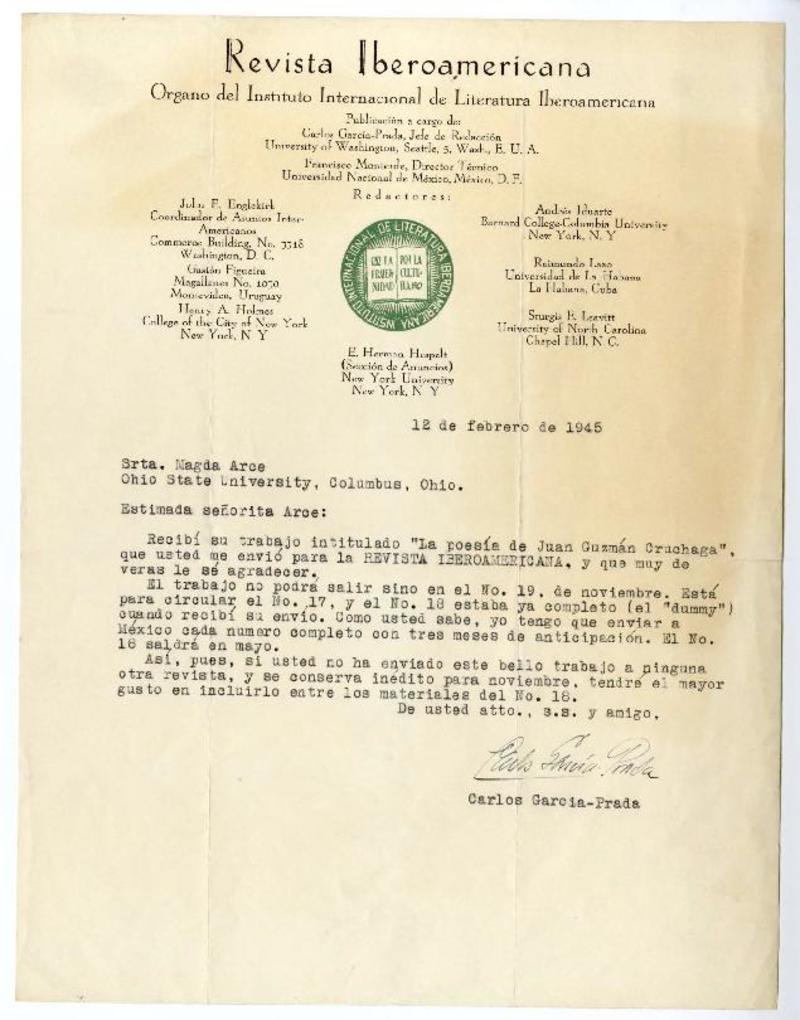 New York [a] Magda Arce, Ohio State University, Columbus, Ohio Carta, 1945 febrero 12, [manuscrito] Carlos García-Prada.