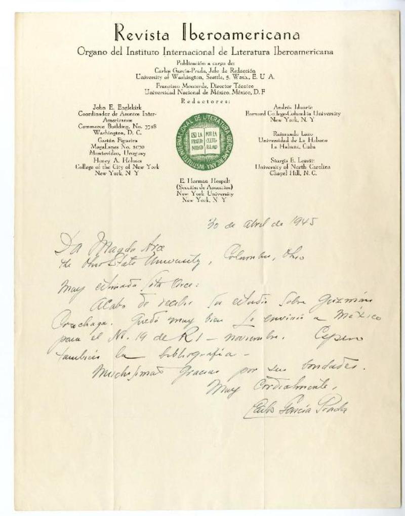 New York [a] Magda Arce, The Ohio State University, Columbus, Ohio, [EE.UU.] Carta, 1945 abril 30, [manuscrito] Carlos García-Prada.