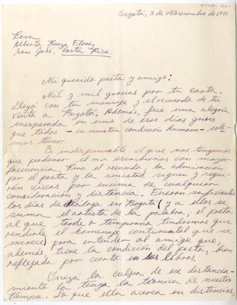 Bogotá, Colombia [a] Alberto Baeza Flores, San José, Costa Rica Carta, 1971 diciembre 3, [manuscrito] José Pubén.