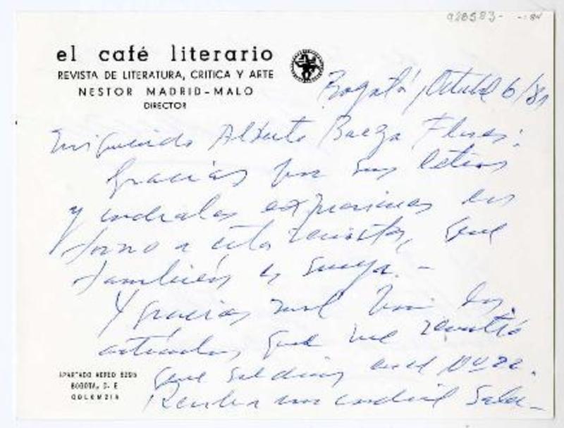 Bogotá, Colombia [a] Alberto Baeza Flores Tarjeta, 1981 octubre 6, [manuscrito] Néstor Madrid-Malo.