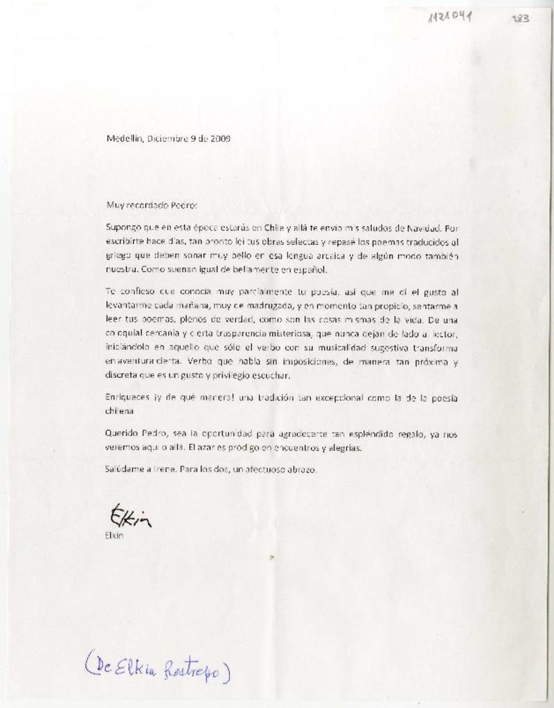 Medellín, Colombia [a] Pedro Lastra Carta, 9 de diciembre 2009, [manuscrito] Elkin Restrepo.