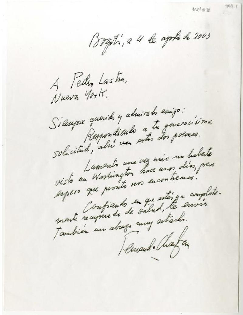 Bogotá, Colombia [a] Pedro Lastra, New York Carta, 4 de agosto 2003, [manuscrito] Fernando Charry Lara.