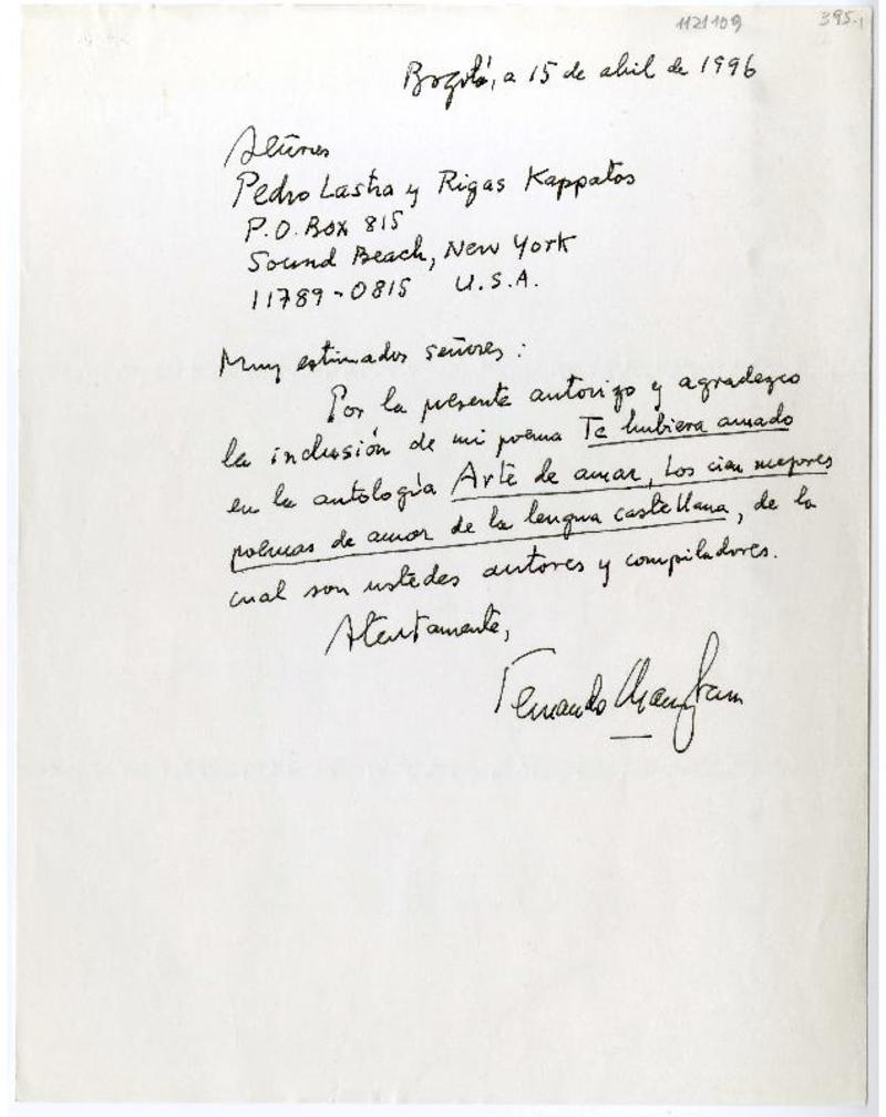 Bogotá, Colombia [a] Pedro Lastra, New York Carta, 15 de abril 1996, [manuscrito] Fernando Charry Lara.