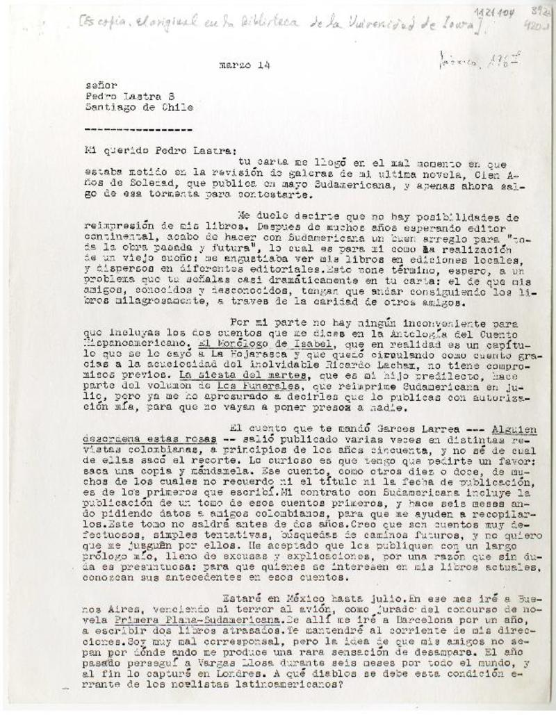 México [a] Pedro Lastra, Santiago, Chile Carta, 1967 marzo 14, [manuscrito] Gabriel García Márquez.