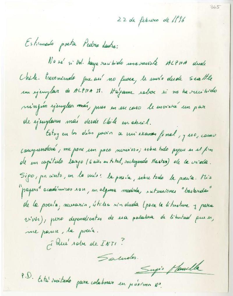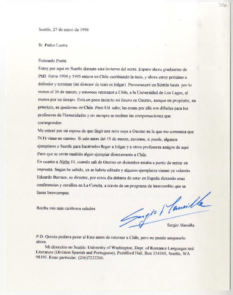 Seattle, Washington D. C. [a] Pedro Lastra Carta, 22 de febrero 1996, [manuscrito] Sergio Mansilla Torres.