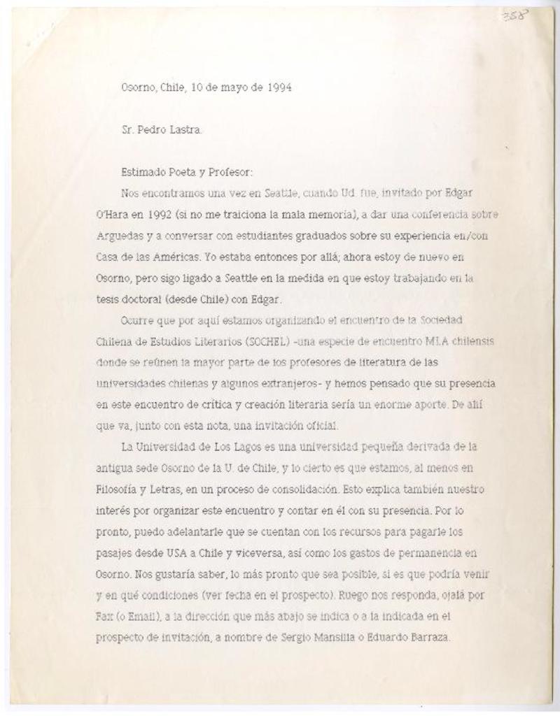 Osorno, Chile [a] Pedro Lastra Carta, 10 de mayo 1994, [manuscrito] Sergio Mansilla Torres.