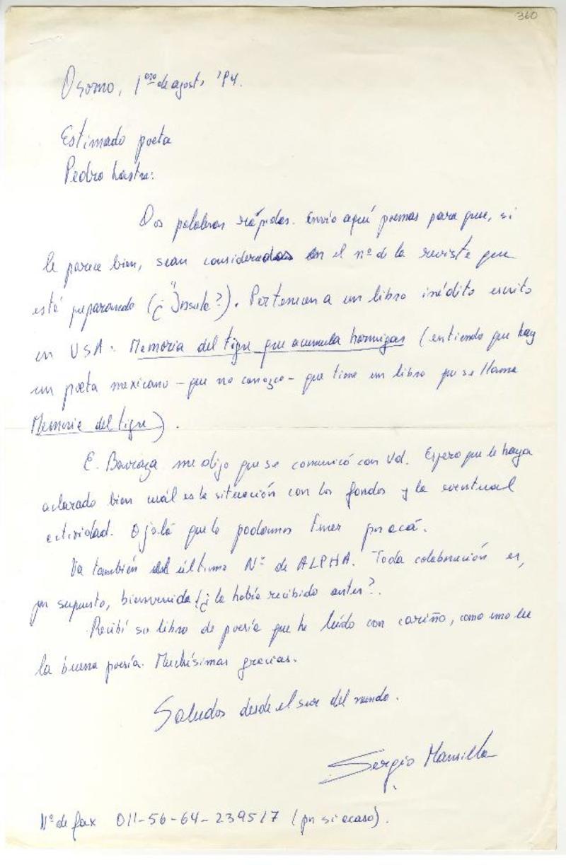 Osorno, Chile [a] Pedro Lastra Carta, 1 de agosto 1994, [manuscrito] Sergio Mansilla Torres.