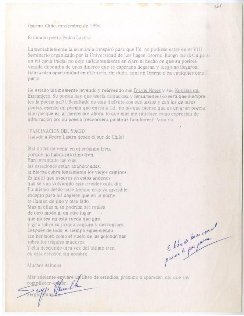 Osorno, Chile [a] Pedro Lastra Carta, Noviembre 1994, [manuscrito] Sergio Mansilla Torres.