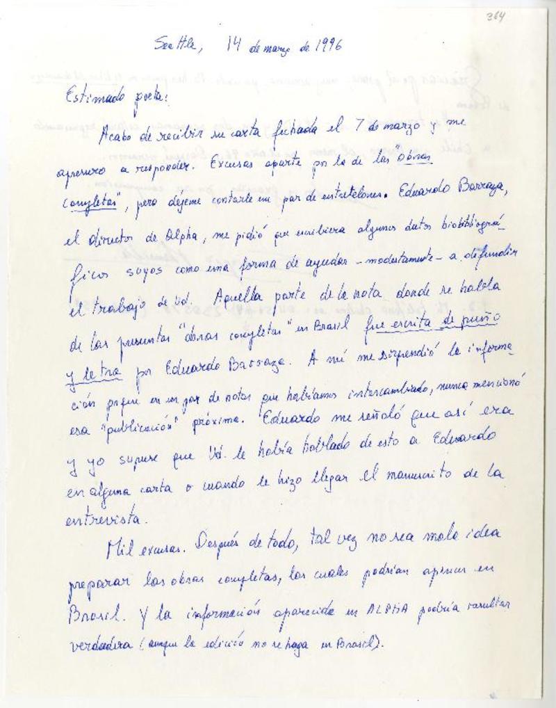 Seattle, Washington D. C. [a] Pedro Lastra Carta, 14 de marzo 1996, [manuscrito] Sergio Mansilla Torres.