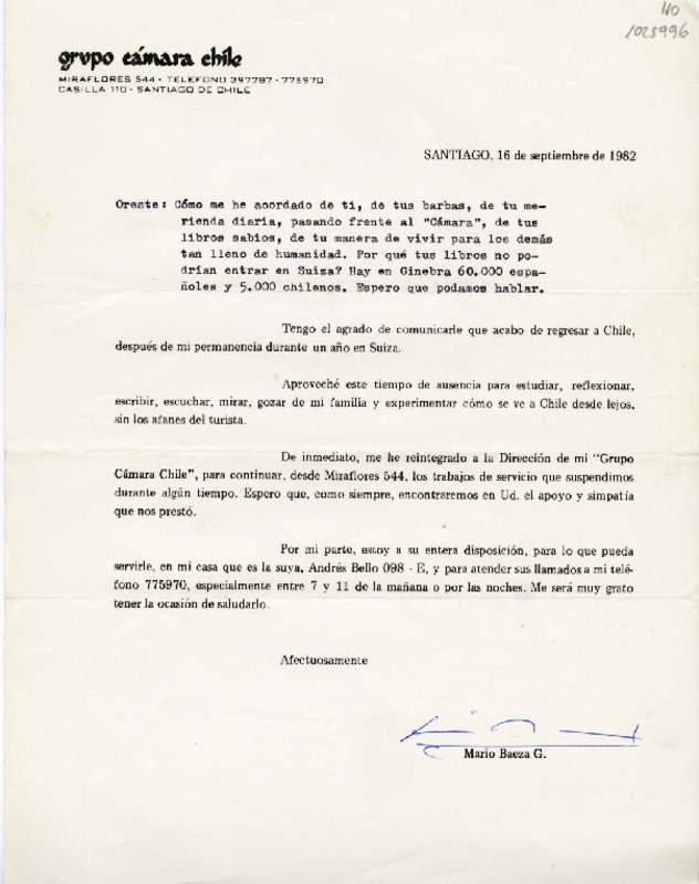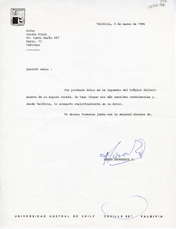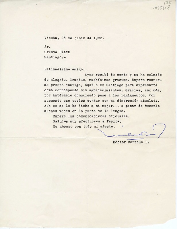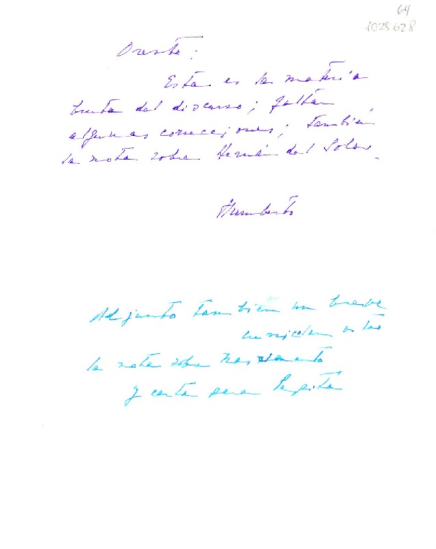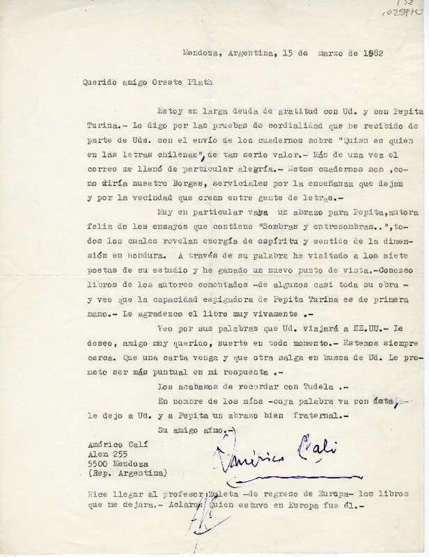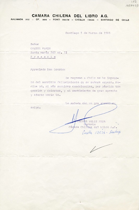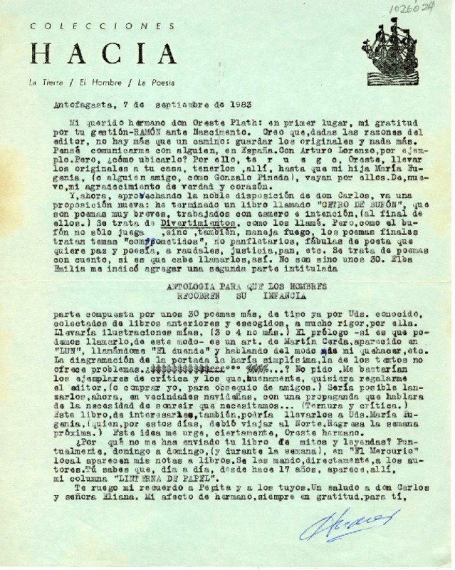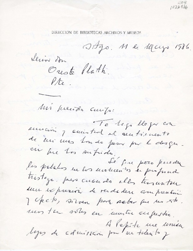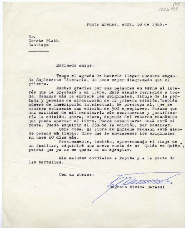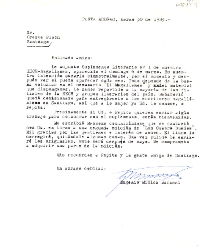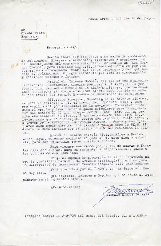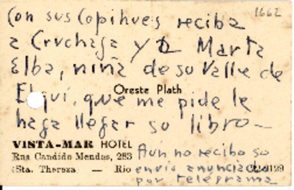 Zambelli, Hugo - Manuscritos chilenos - Autores chilenos - Correspondencia - Plath, Oreste