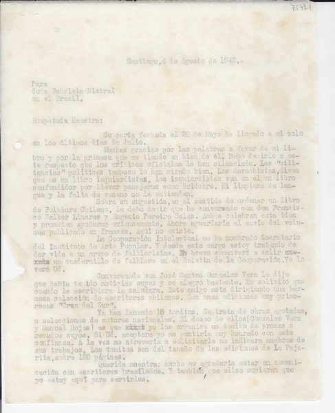 [Carta] 1942 ago. 4, Santiago, [Chile] [a] Gabriela Mistral, Brasil [manuscrito] O[reste] Plath.