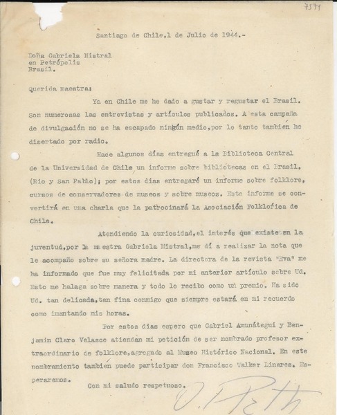 [Carta] 1944 jul. 1, Santiago, [Chile] [a] Gabriela Mistral, Petrópolis, Brasil [manuscrito] O[reste] Plath.