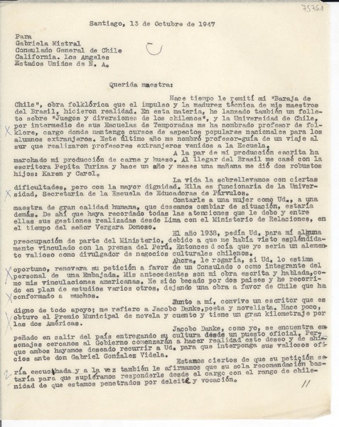 [Carta] 1947 oct. 13, Santiago, [Chile] [a] Gabriela Mistral, Los Angeles, Estados Unidos [manuscrito] Oreste Plath, Jacobo Danke.