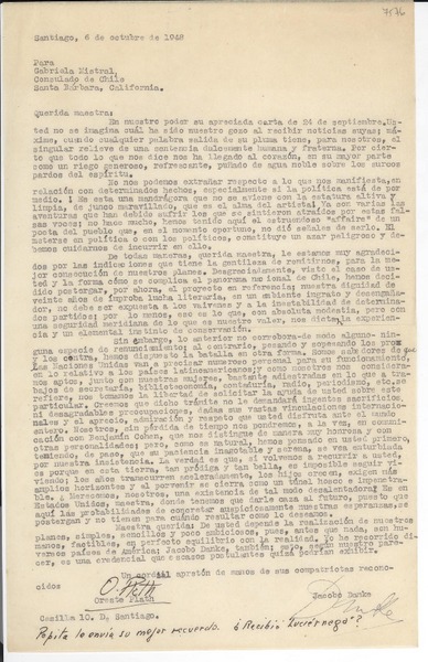 [Carta] 1948 oct. 6, Santiago, [Chile] [a] Gabriela Mistral, Santa Bárbara, California, [Estados Unidos] [manuscrito] Oreste Plath, Jacobo Danke.