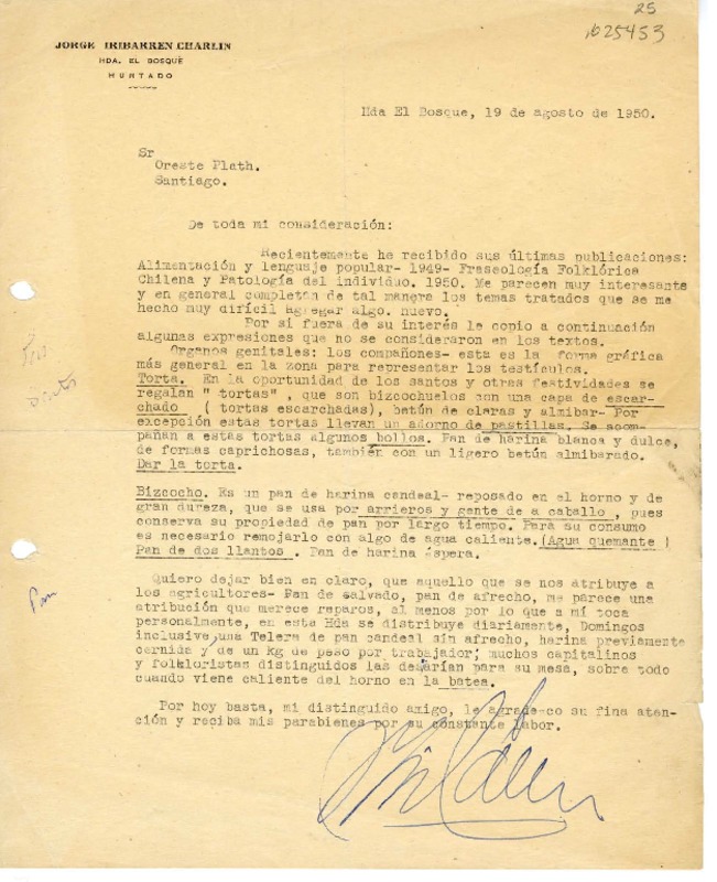 [Carta] 1950 agosto 19, Hacienda El Bosque [Ovalle], Chile [a] Oreste Plath [manuscrito] Jorge Iribarren Charlin.