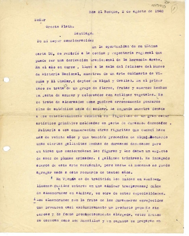 [Carta] 1948 agosto 2, Hacienda El Bosque [Ovalle], Chile [a] Oreste Plath [manuscrito] Jorge Iribarren Charlin.