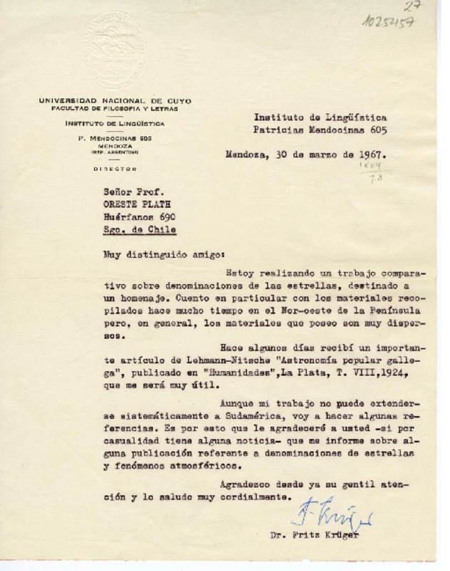 [Carta] 1967 marzo 30, Mendoza, Argentina [a] Oreste Plath, Santiago, Chile [manuscrito] Fritz Krüger.