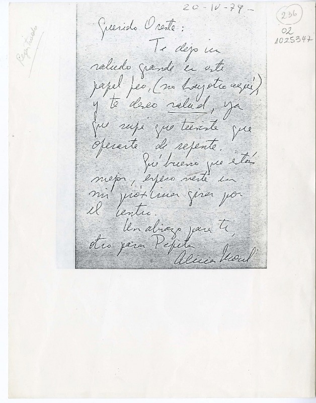 [Carta] 1979 abril 20, [Santiago], [Chile] [a] Oreste Plath [manuscrito] Alicia Morel.