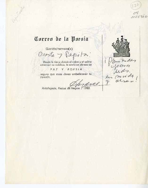 [Tarjeta] 1980 Pascua de Negros, Antofagasta, Chile [a] Oreste Plath [manuscrito] Andrés Sabella.