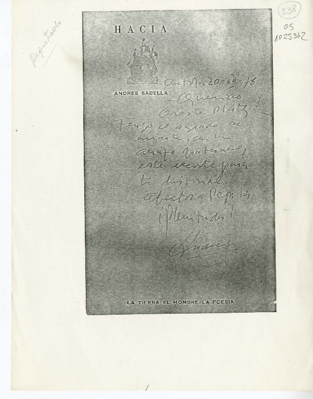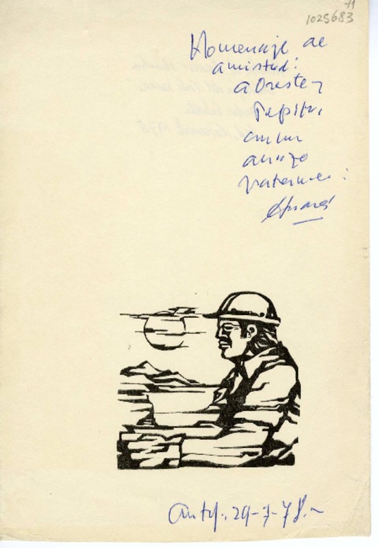 [Tarjeta] 1978, Antofagasta, [Chile] [a] Oreste Plath [manuscrito] Andrés Sabella.