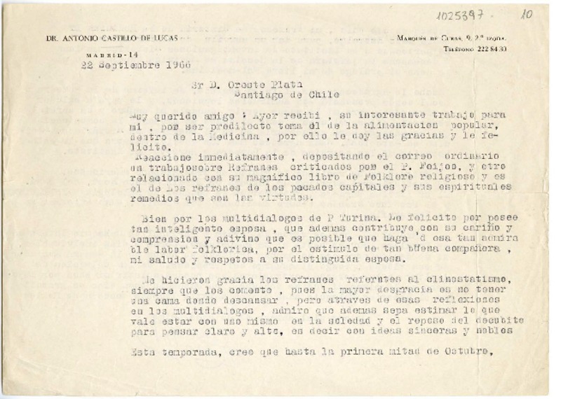 [Carta] 1966 septiembre 22, Madrid, España [a] Oreste Plath, Santiago de Chile [manuscrito] Antonio Castillo de Lucas.