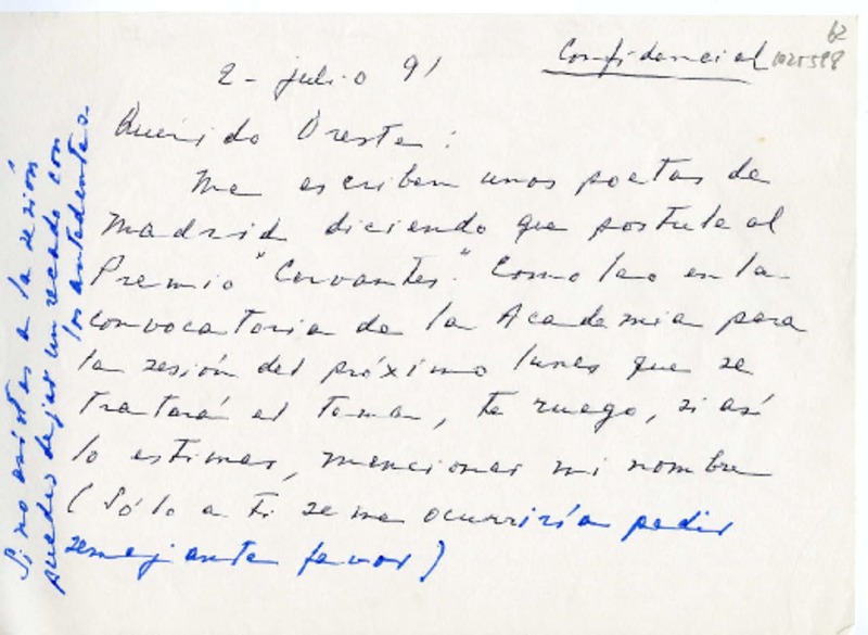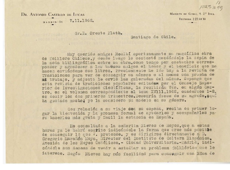 [Carta] 1962 noviembre 7, Madrid, España [a] Oreste Plath, Santiago de Chile [manuscrito] Antonio Castillo de Lucas.