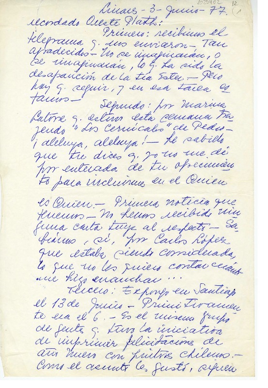 [Carta] 1977 junio 3, Linares, Chile [a] Oreste Plath [manuscrito] Emma Jauch.
