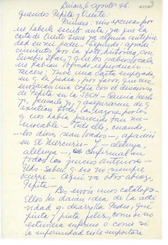[Carta] 1976 agosto 6, Linares, Chile [a] Oreste Plath [manuscrito] Emma Jauch.