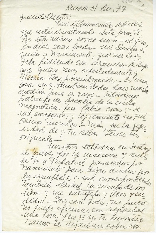 [Carta] 1977 diciembre 29, Santiago, Chile [a] Oreste Plath [manuscrito] Alicia Morel.