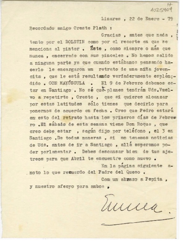 [Carta] 1979 enero 22, Linares, Chile [a] Oreste Plath [manuscrito] Emma Jauch.