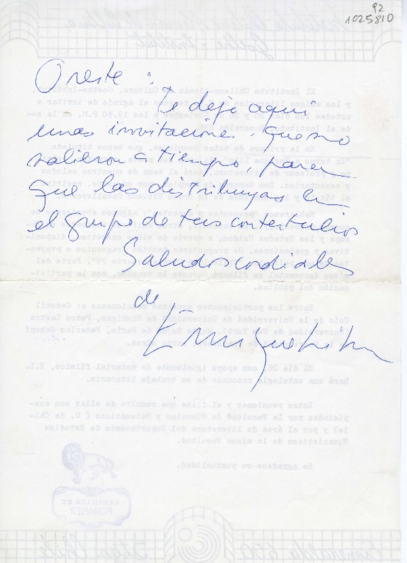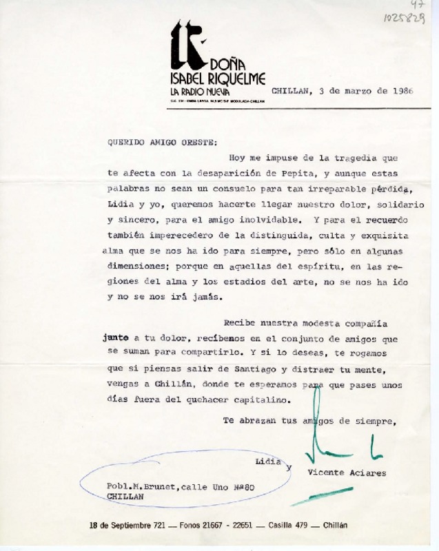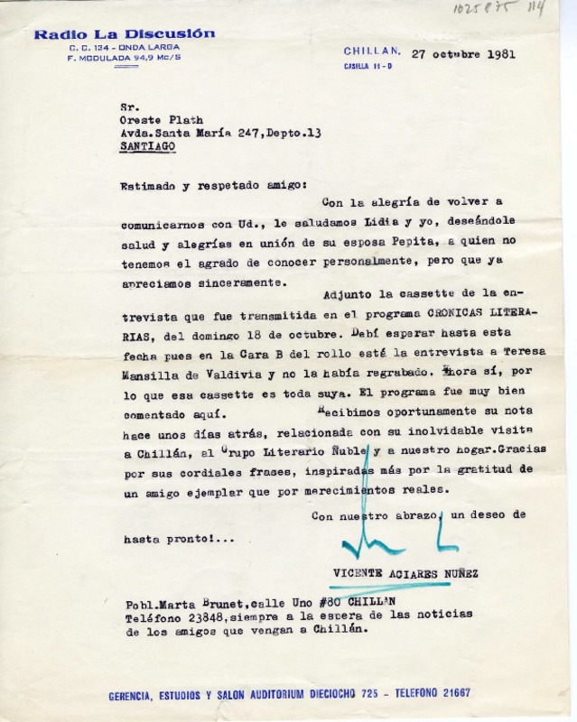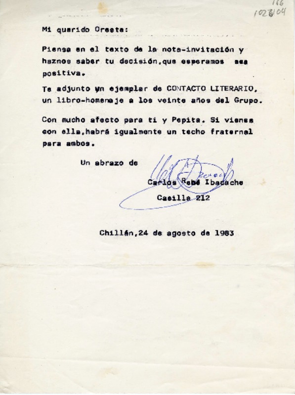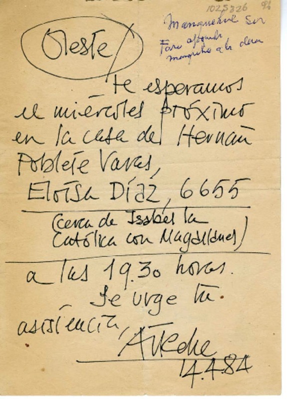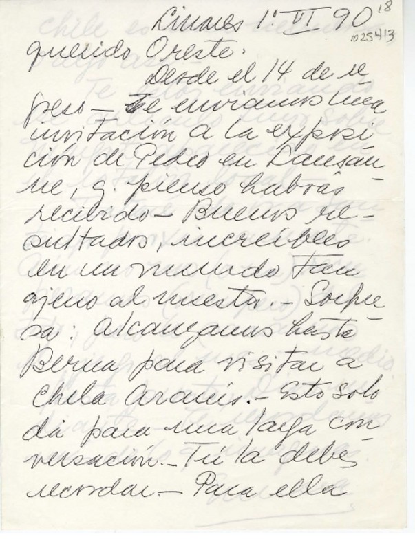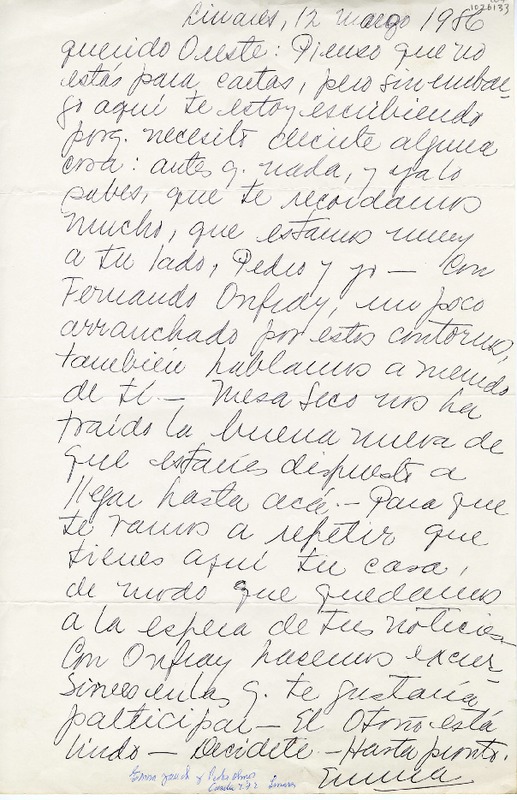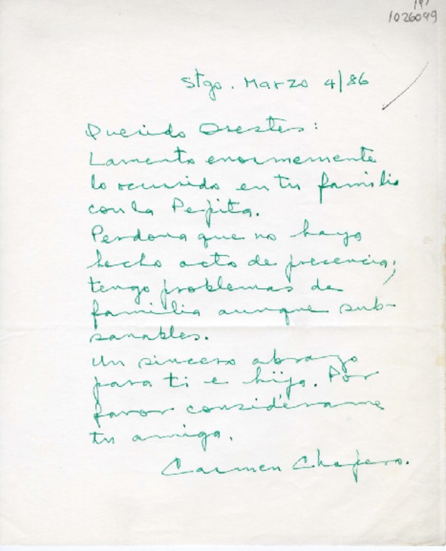 [Carta] 1986, Santiago, Chile [a] Oreste Plath [manuscrito] Ximena Adriazola.